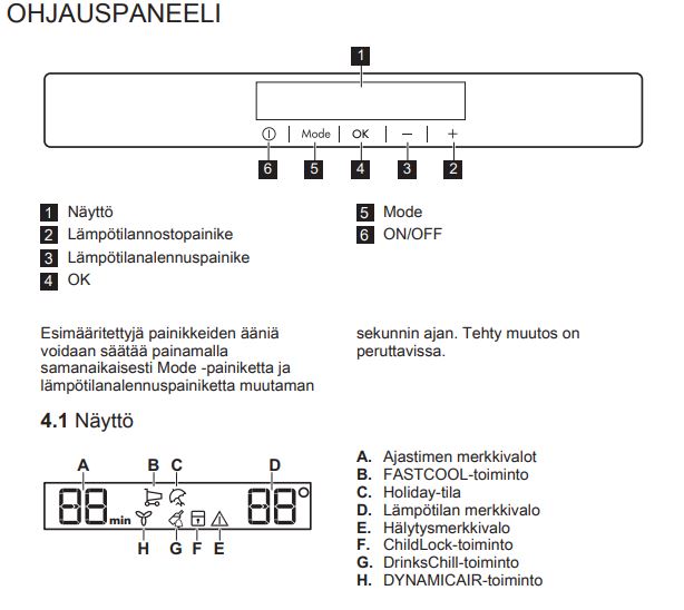 Jos jääkaapin ovi jätetään auki noin 5 minuutiksi, kuuluu äänimerkki ja hälytyksen merkkivalo vilkkuu. Hälytys lakkaa, kun ovi suljetaan. Hälytyksen aikana ääni voidaan mykistää painamalla mitä tahansa painiketta.