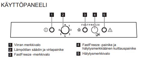 Kun pakastinosaston lämpötila nousee (esimerkiksi aikaisemman sähkökatkon vuoksi), hälytys- ja pakastimen lämpötilan merkkivalot vilkkuvat ja kuuluu äänimerkki.