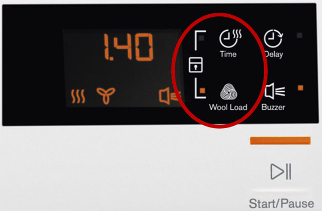 - Kuivausrummun näytössä on riippulukko, eikä koneella voi tehdä mitään